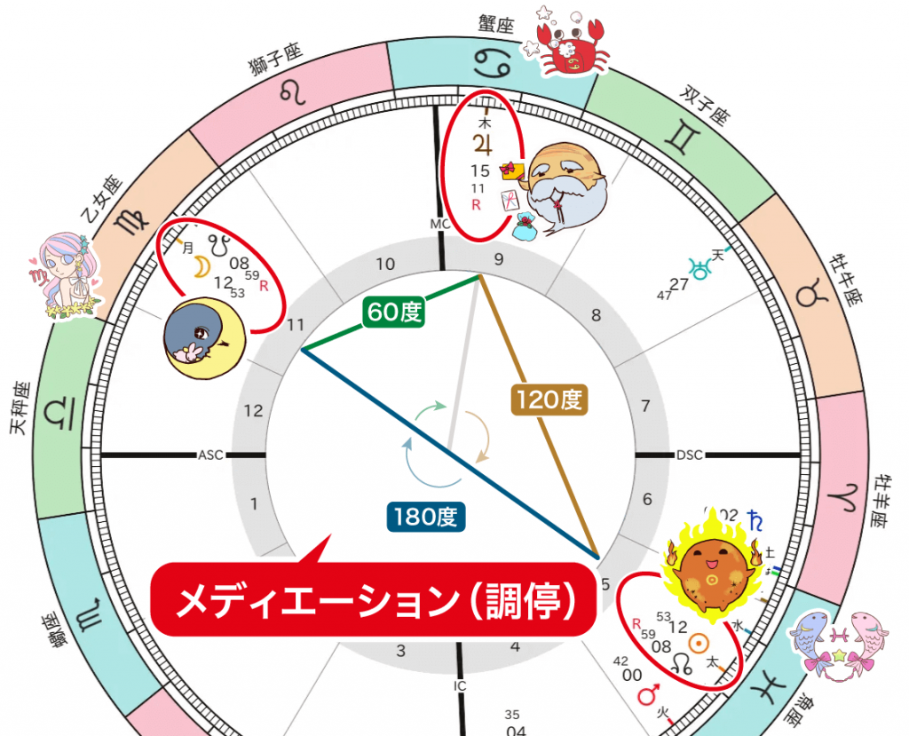 対向する2つの天体に対して、緊張を和らげて間を取り持つように作用するのが調停(メディエーション)です。
