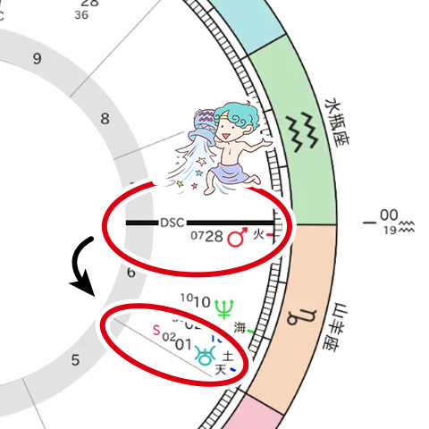 7ハウスのカスプは、ディセンダント(DSC)と呼ばれる場所で、なこちゃんのDSCは、水瓶座1度にあります。