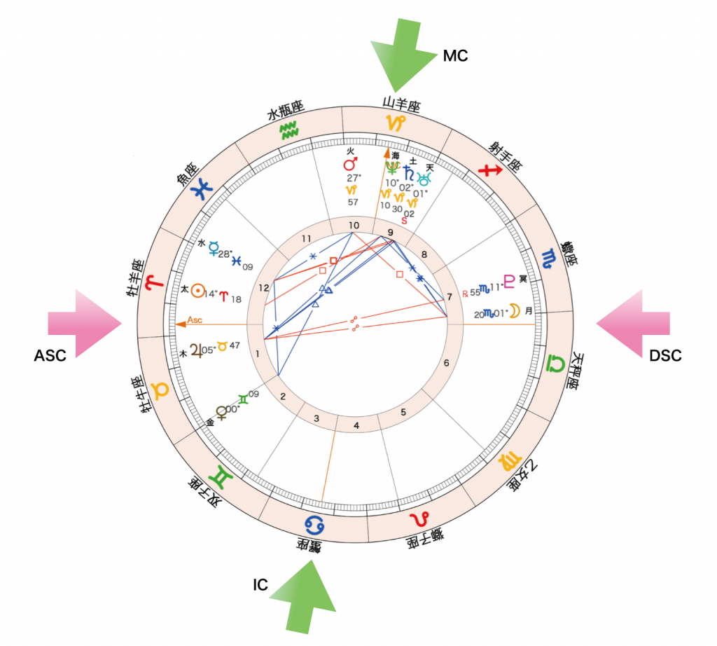 ホロスコープ上では、アセンダント(ASC) と MC(エムシー)が記載されています。