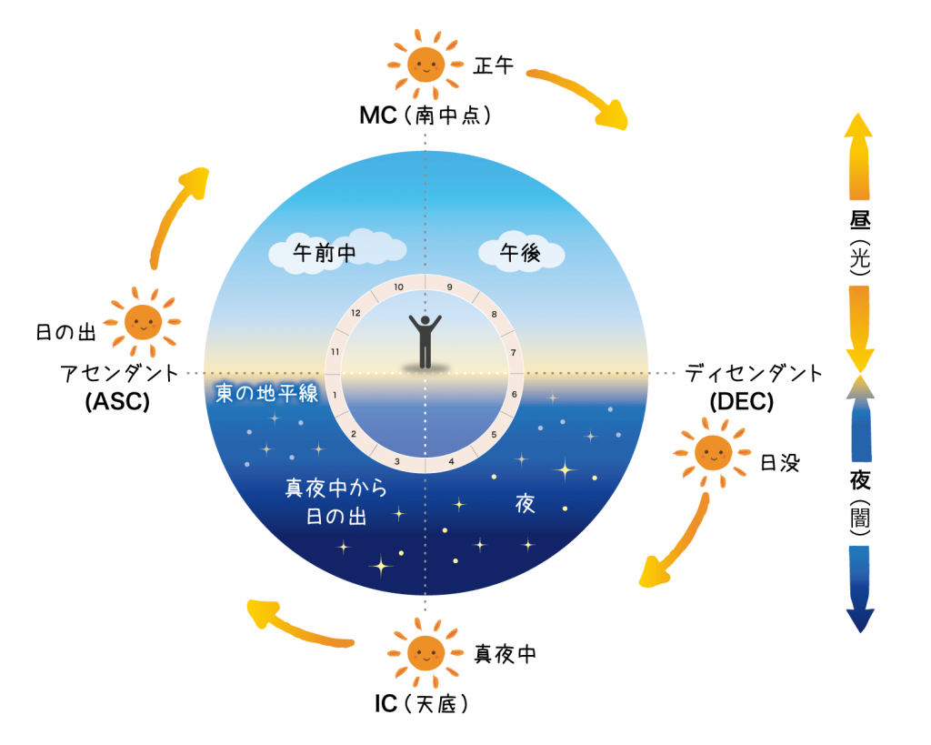 このように、地上から見た太陽の動きが、地平線や天頂・天底と交わるポイントを指し示しているのがアングルです。