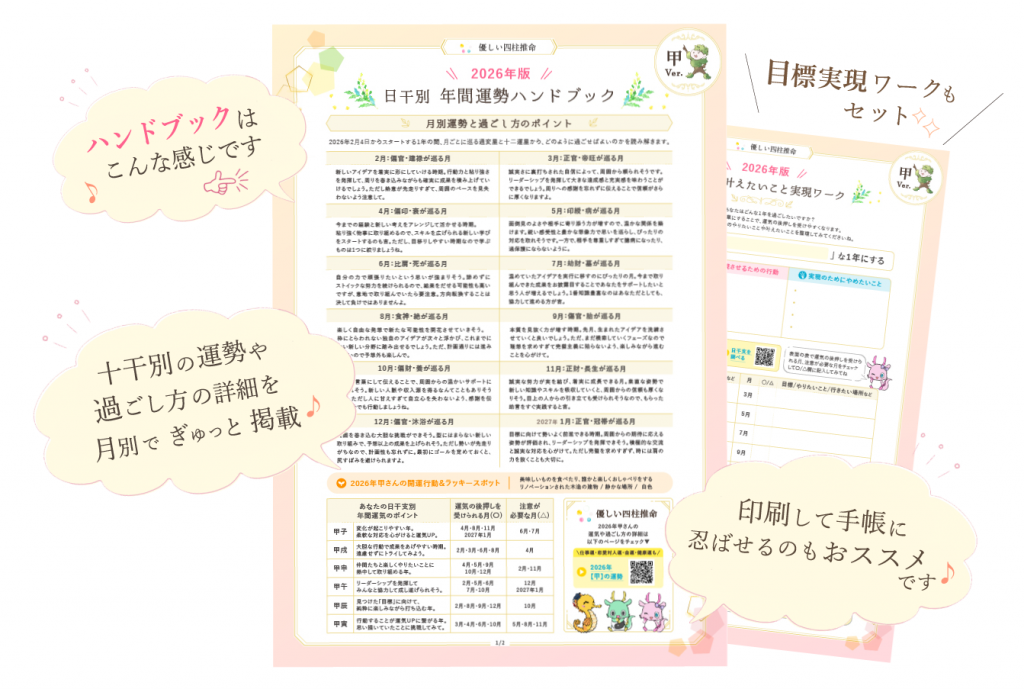 あなたの日干支が持つテーマを毎日の生活に活かしながら、明るくいきいきとした2026年をお過ごしください。